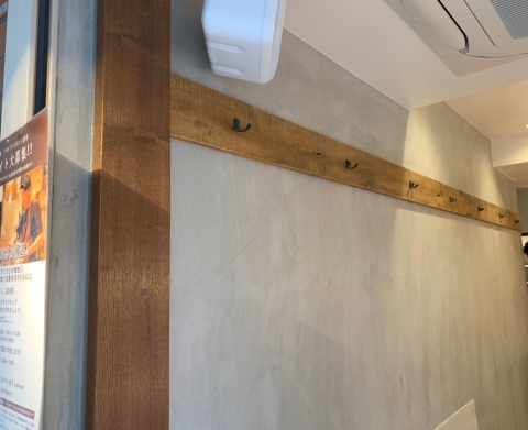 ウォールラック、大型ミラーフレーム、壁面装飾など随所に古材風木材を使用しております。
